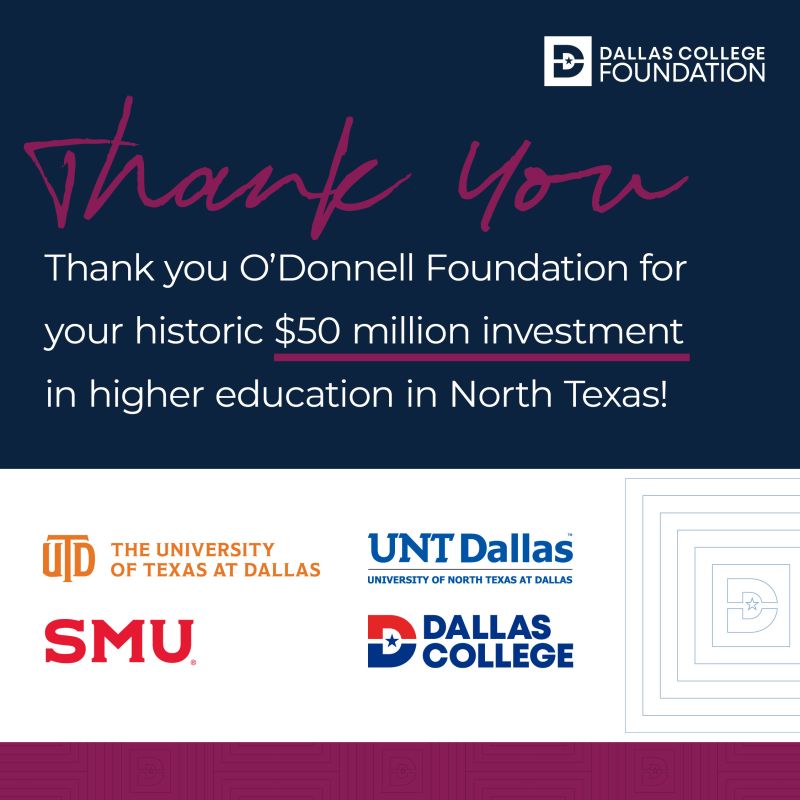 With this investment, Dallas County Promise students will gain greater financial support, tailored advising, and long-term pathways to success—strengthening the region’s workforce and economy for years to come. We’re grateful to the O’Donnell Foundation for their incredible commitment to Dallas County students, and excited to be a part of the thousands of bright futures it will enable.